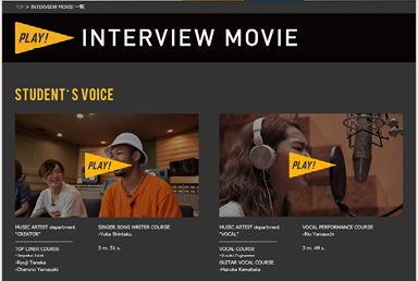 新設のトップライナーコースを含め、音楽アーティスト科に所属する学生へのインタビューを実施。そのインタビュー記事と動画を特設サイトで公開しました。ターゲットと近い目線の学生自身の言葉で、授業内容や学生生活のことを伝える事で、ターゲットとの親和性を生むことを目的とした提案です。